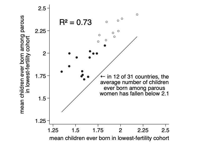 Falling birth rates can be decomposed into two components: (1) an increase in childlessness (i.e., lifetime nulliparity), and (2) fewer children ever born to women who have at least one child (completed cohort fertility among the parous). This paper quantifies the contributions of these two components for women in advanced economies in Europe, North and South America, and southeast Asia, and for recent cohorts in Indian districts.